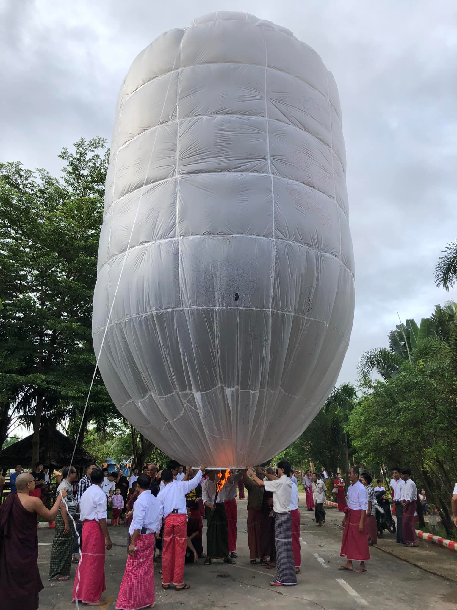 Community members gather in unity to release a handmade hot air balloon, symbolizing hope, merit, and the sending of prayers to the heavens. This vibrant tradition is part of Tawthalin or Waso festivals, reflecting devotion, joy, and the beauty of Mon cultural celebrations.